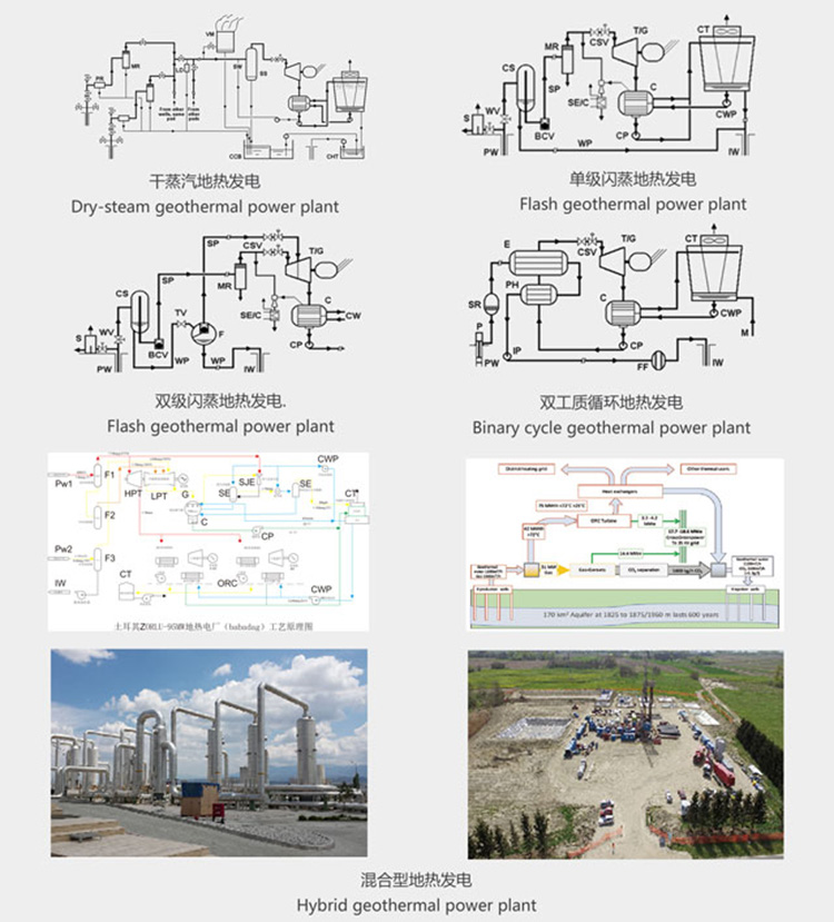 地熱發(fā)電需根據(jù)地熱流體的溫度、壓力以及它們的水、汽品質(zhì)的不同而采取不同的設計方案。其主要類型包括:干蒸汽地熱發(fā)電、單級閃蒸地熱發(fā)電、雙級閃蒸地熱發(fā)電、一井一站地熱發(fā)電、混合型地熱發(fā)電、雙工質(zhì)循環(huán)地熱發(fā)電、干熱巖發(fā)電。